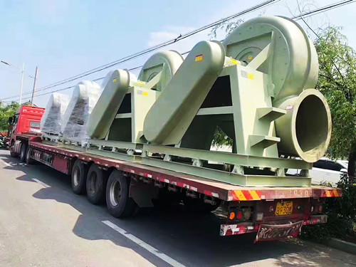 在前文中介紹過有關于玻璃鋼離心風機的方向方面的知識,簡單來說風機的方向主要是為了方便風機的安裝工作。風機的方向主要體現在風機的出風口位置,當風機的出風口平吹時說明風機的方向為180°或者0°。以玻璃鋼風機葉輪的中心點做一道水平線,當出風口在上方時代表風機的方向為180°,當出風口在水平線下方時則代表風機的方向為0°。下面是0°方向的玻璃鋼離心風機安排發貨圖。