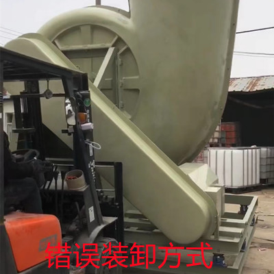 a、玻璃鋼風機除了風機架子、電動機、軸承箱等配件外,其它的配件都是玻璃鋼材料制作的,無論是硬度還是抗壓能力都要弱一些,在裝卸過程中使用不合理的方式很可能會導致配件損壞。比如上圖中使用叉車裝卸風機的方式就是錯誤的,因為叉車的護板正對著皮帶保護罩,稍有不能就可能導致皮帶罩與護板撞擊而受到損壞。